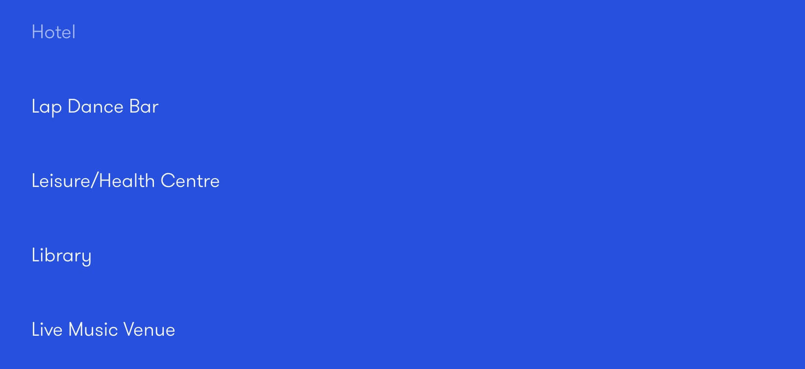 In the form, select your business type. This is a very long list, ordered alphabetically, and covering all types of venues from “Bowling Alley” to “Cruise Ship” or “Hairdresser”. You will for sure find an entry that corresponds to your business, even if very specific like a “Lap Dance Bar”!